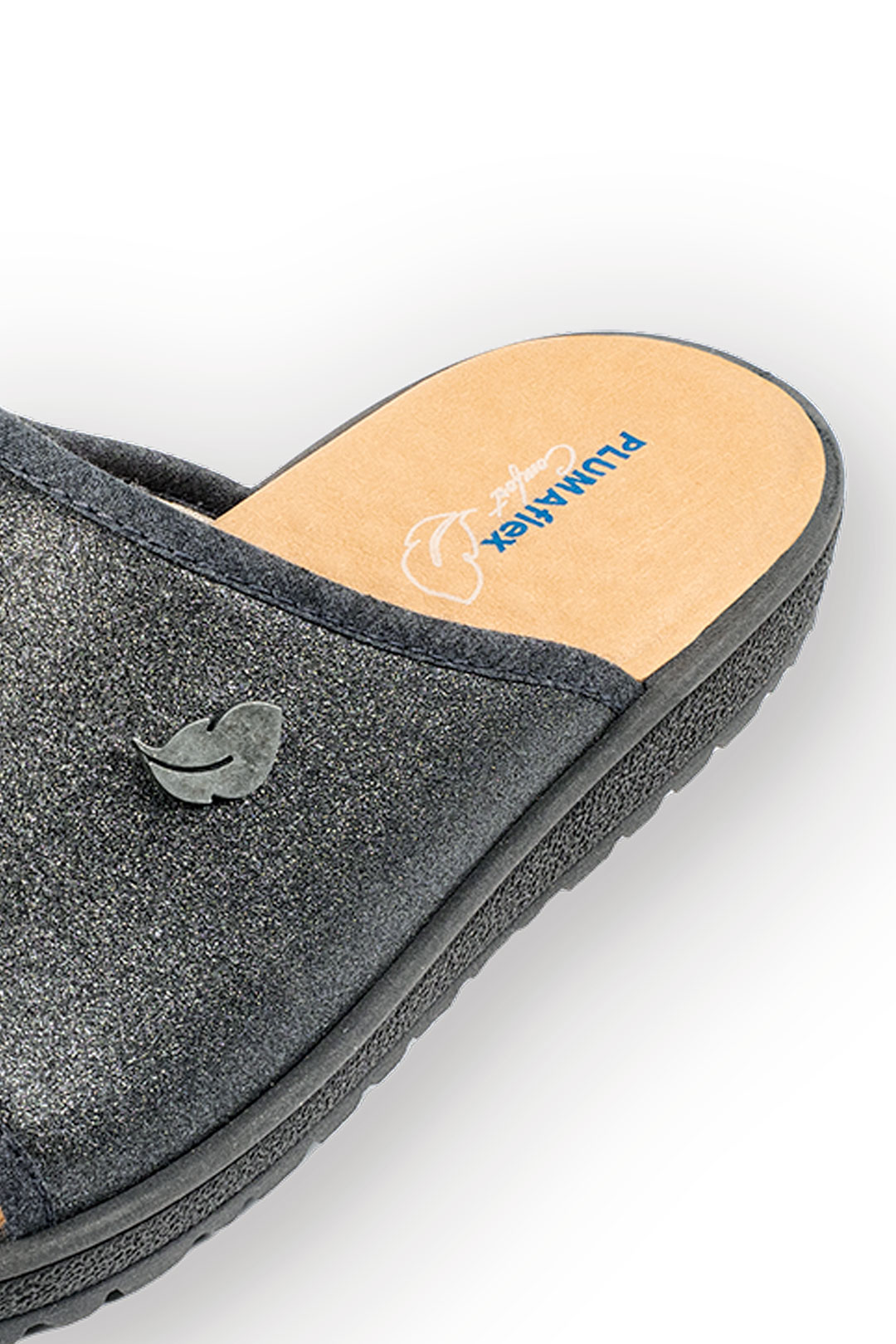 Chinela con pala brillante para estar por casa llana y abierta en la parte delantera para mayor frescor y comodidad. Plantilla PLUMAFLEX muy cómoda para facilitar el descanso de pies y piernas.