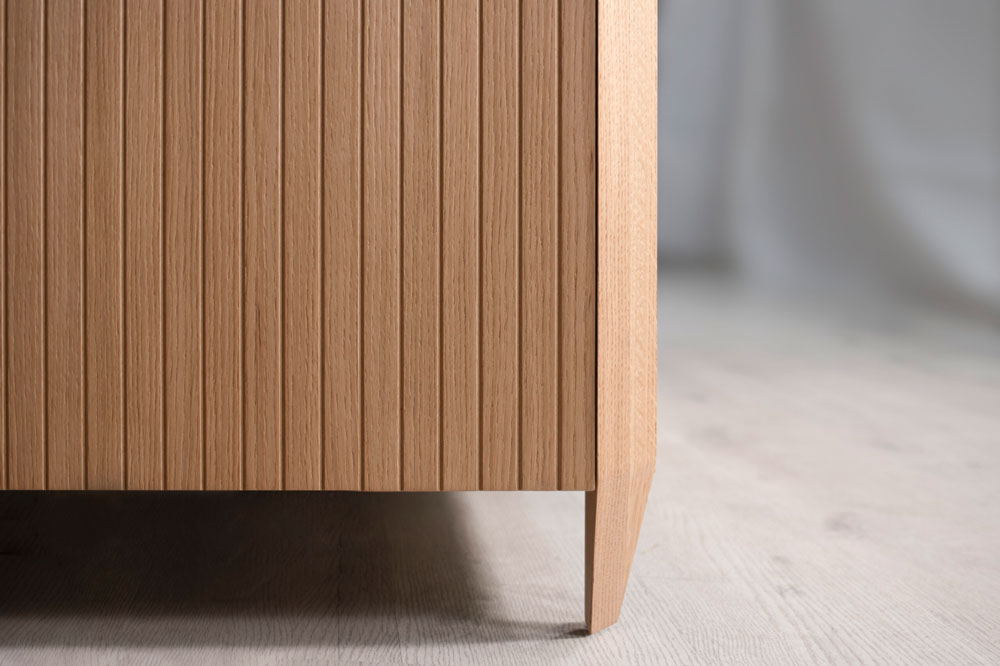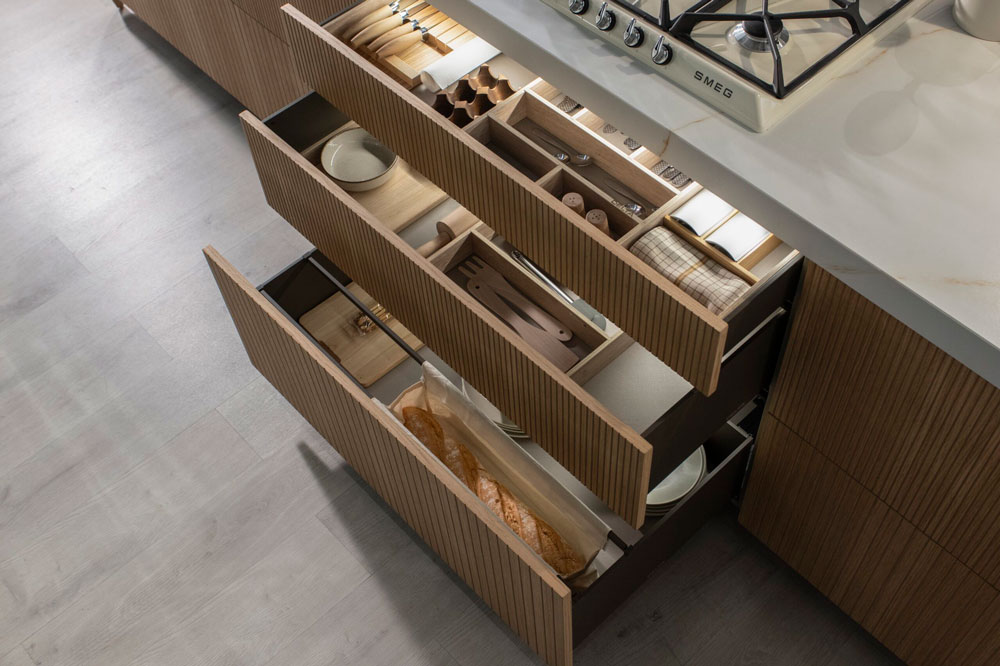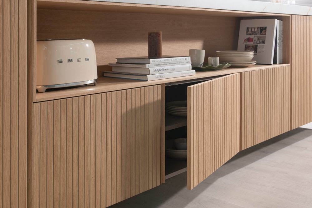 La madera clara del mobiliario, con puertas en acabado roble y regleta biselada integrada, se combina con el verde mate de las columnas, creando una atmósfera serena y equilibrada.