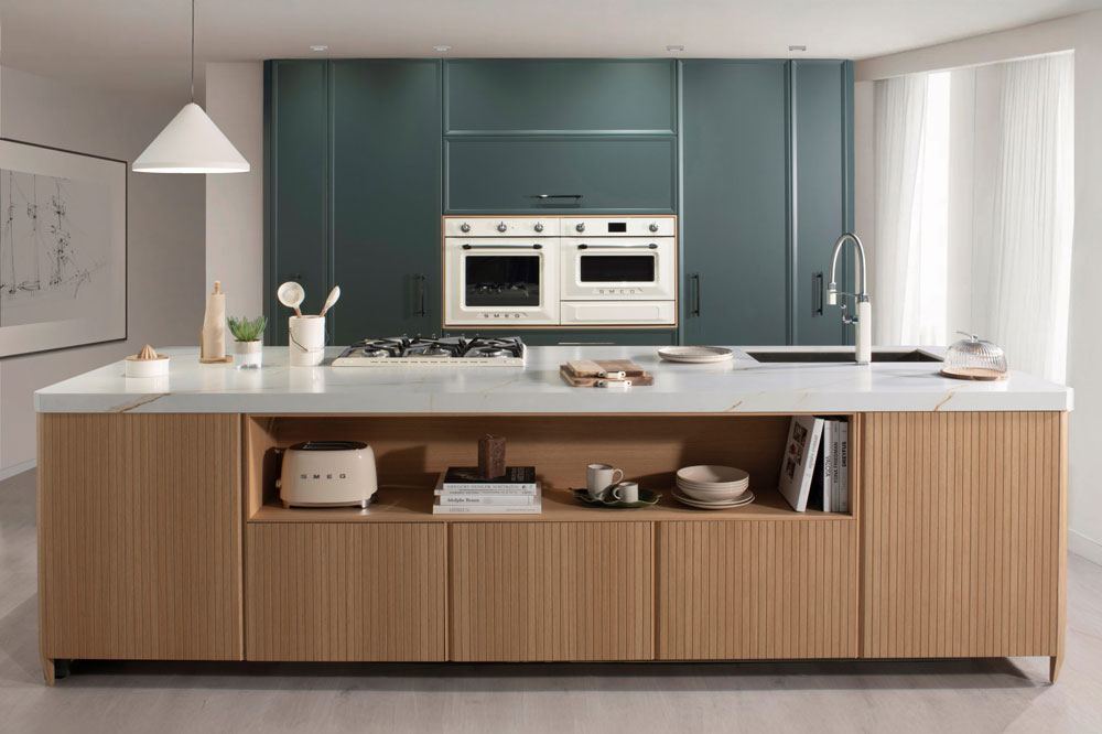 Puertas lacadas Vermont plegables con armazón en rovere claro, electrodomésticos retro y frentes en verde mate para un espacio funcional y con estilo.
