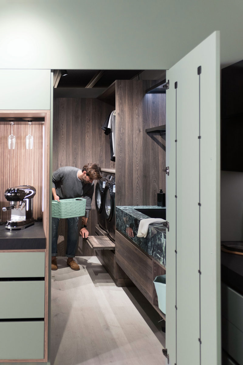 Puerta perfectamente integrada en el mobiliario da acceso a una zona de lavadero oculta, un espacio práctico y funcional que permanece fuera de la vista, manteniendo la armonía visual del conjunto.