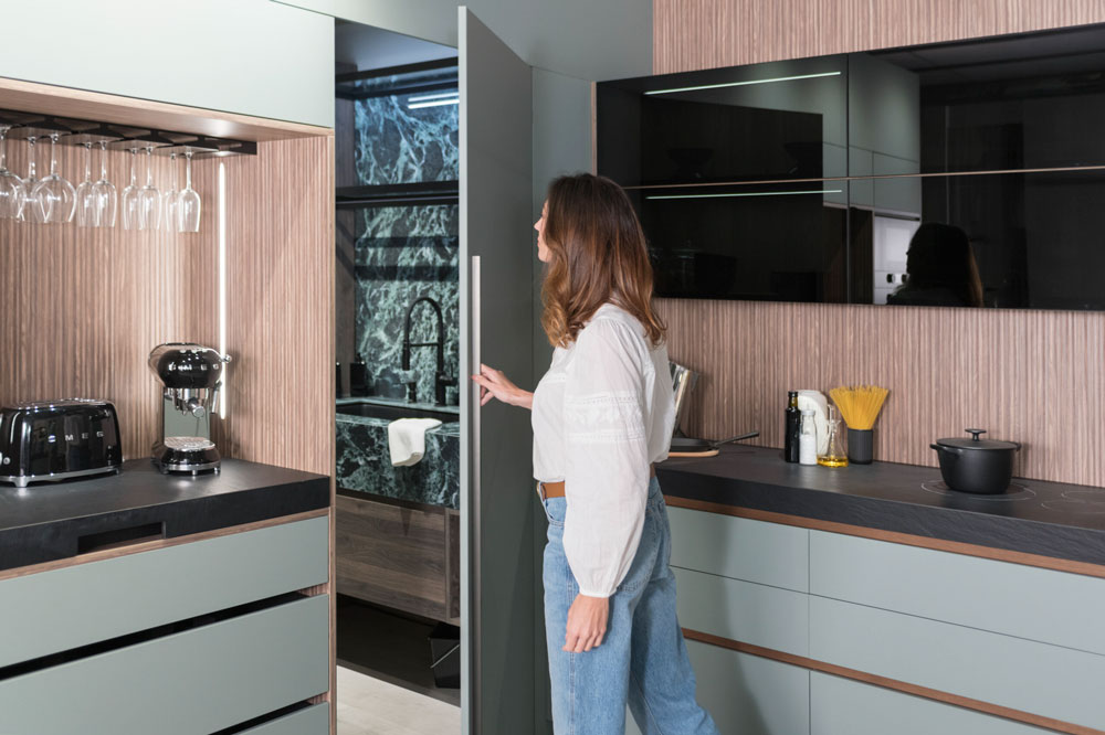 Puerta de acceso al lavadero completamente integrada en el mobiliario. Continuidad visual y funcionalidad sin interrupciones en el diseño de cocina.