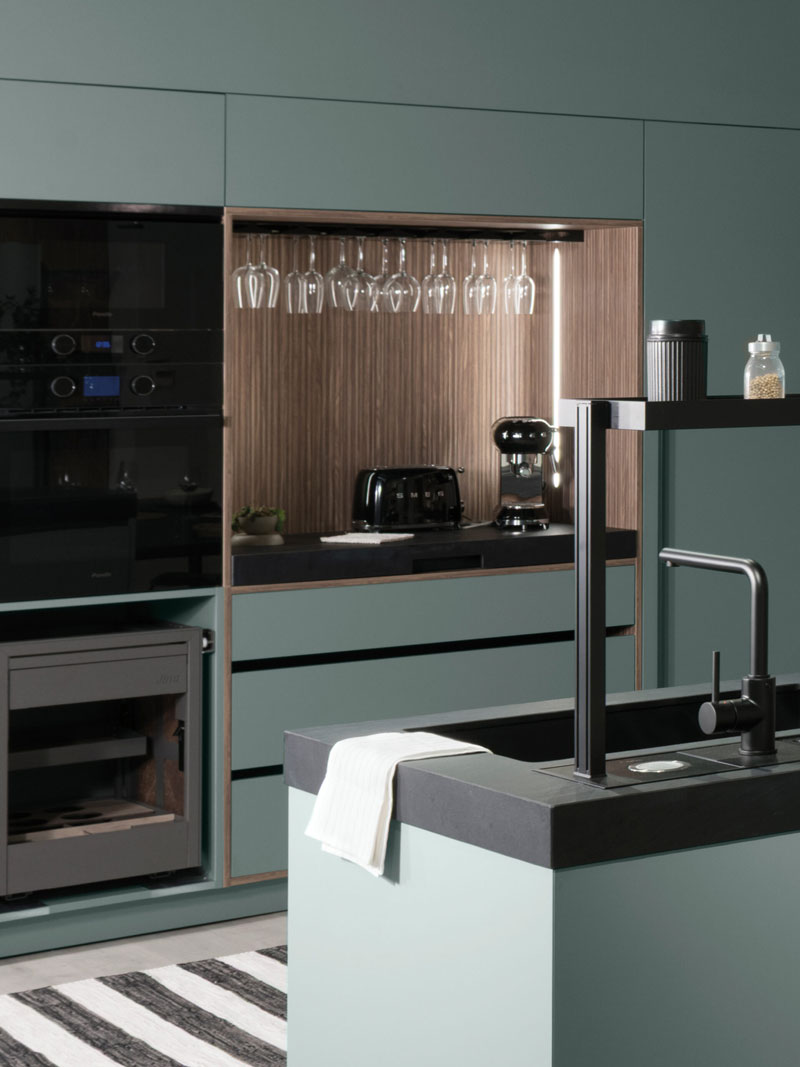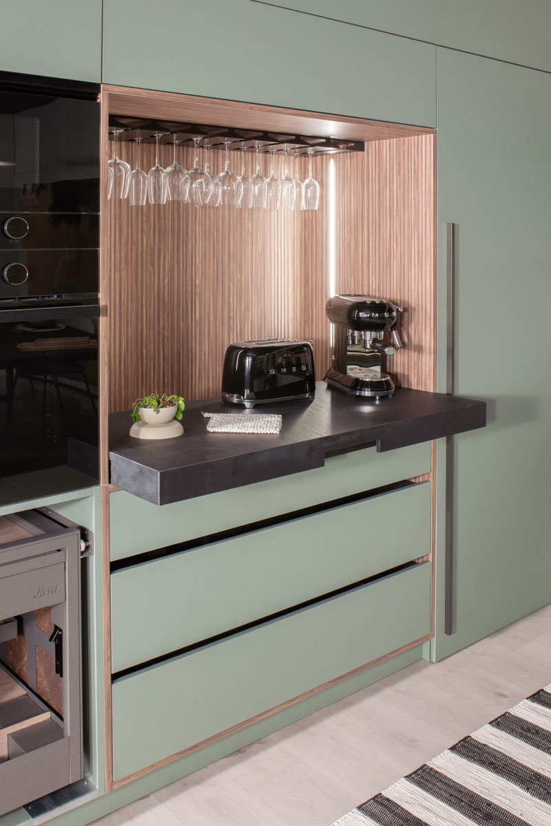 Zona de desayunador integrada, con encimera extraíble y retroiluminación vertical. Un rincón funcional y discreto para el primer café del día, siempre a mano.