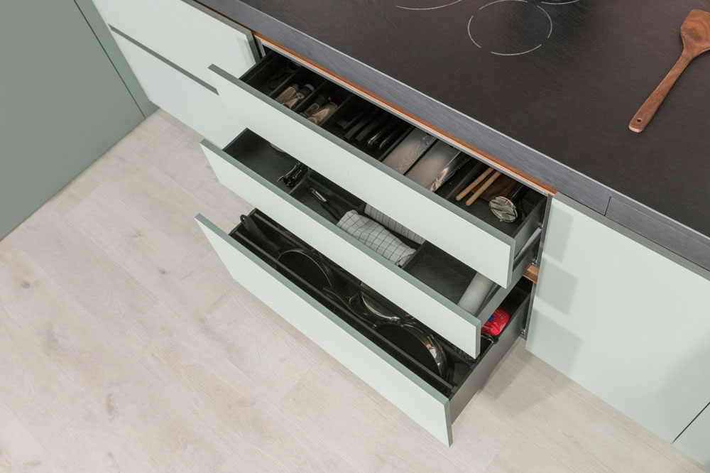 Más que un espacio para cocinar, esta cocina está pensada para vivirla. La combinación de materiales lacados con la calidez de la madera crea un ambiente acogedor, sereno y equilibrado, donde todo fluye de manera natural.