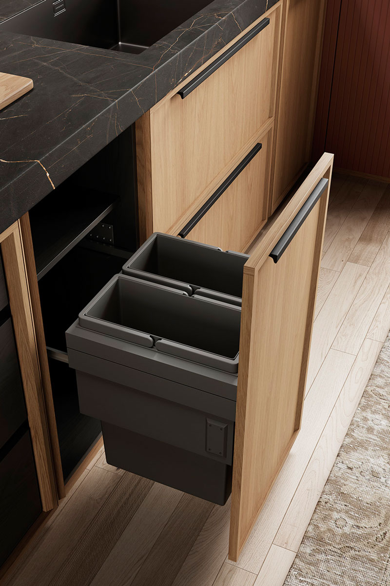 Un sistema de gaveta automática en el mueble rinconero aprovecha hasta el último centímetro de almacenaje, facilitando el acceso y manteniendo todo siempre organizado.