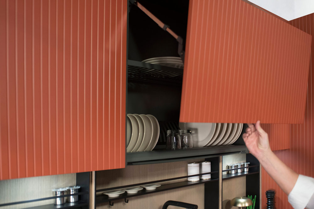 La belleza de esta cocina no solo está en lo que muestra, sino en todo lo que sabe esconder. La fuerza del color Rojo Gales se equilibra con la calidez de la madera y el negro de las superficies de trabajo, creando un ambiente con mucha personalidad y estilo propio.